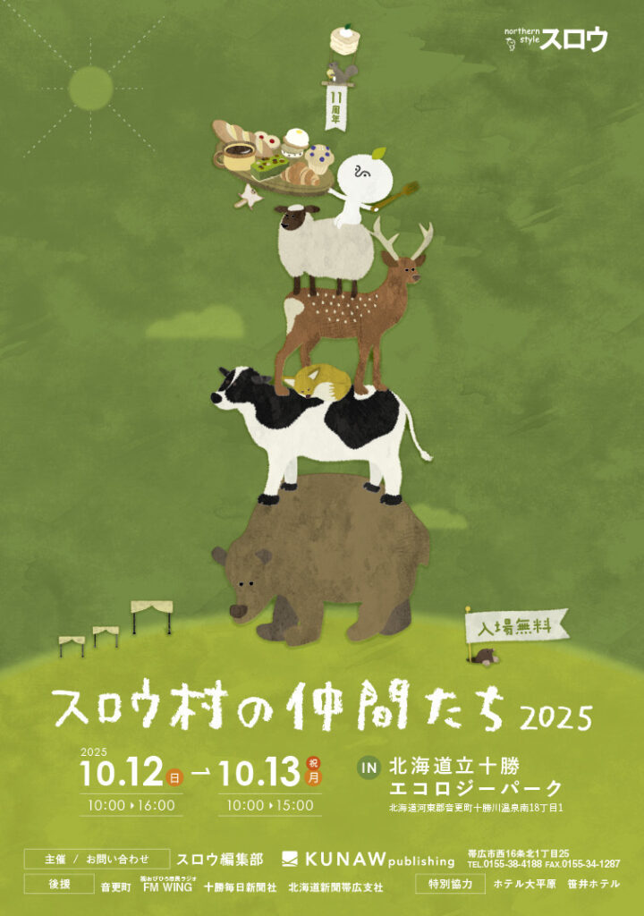 冬の足音が聞こえてくる、短い秋の2日間。雑誌『northern style スロウ』から飛び出したスロウ村の仲間たちが、今年は音更町に集います。出合えるのは、おいしい食べ物、心温まる作家の作品。北海道への思いを会場のみんなで分かち合う、ホクホクのじゃがいもみたいな、あったかい集いです。